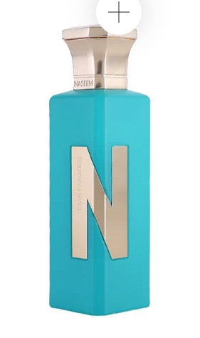 Presentation: Turquoise-matte glass bottle with fine mist aromatizer.